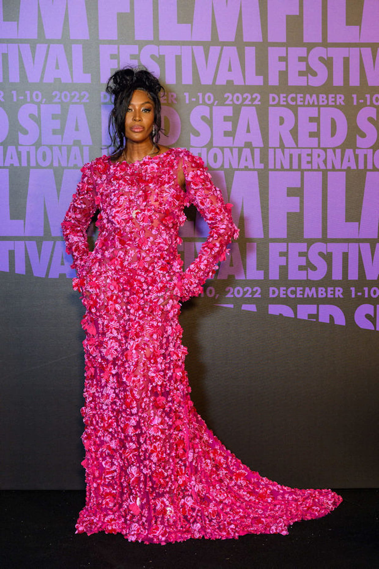 Naomi Campbell en robe rose brodée de fleurs à traîne Valentino au gala Celebration of Women in Cinema au Cap d'Antibes le 21 mai 2022.
