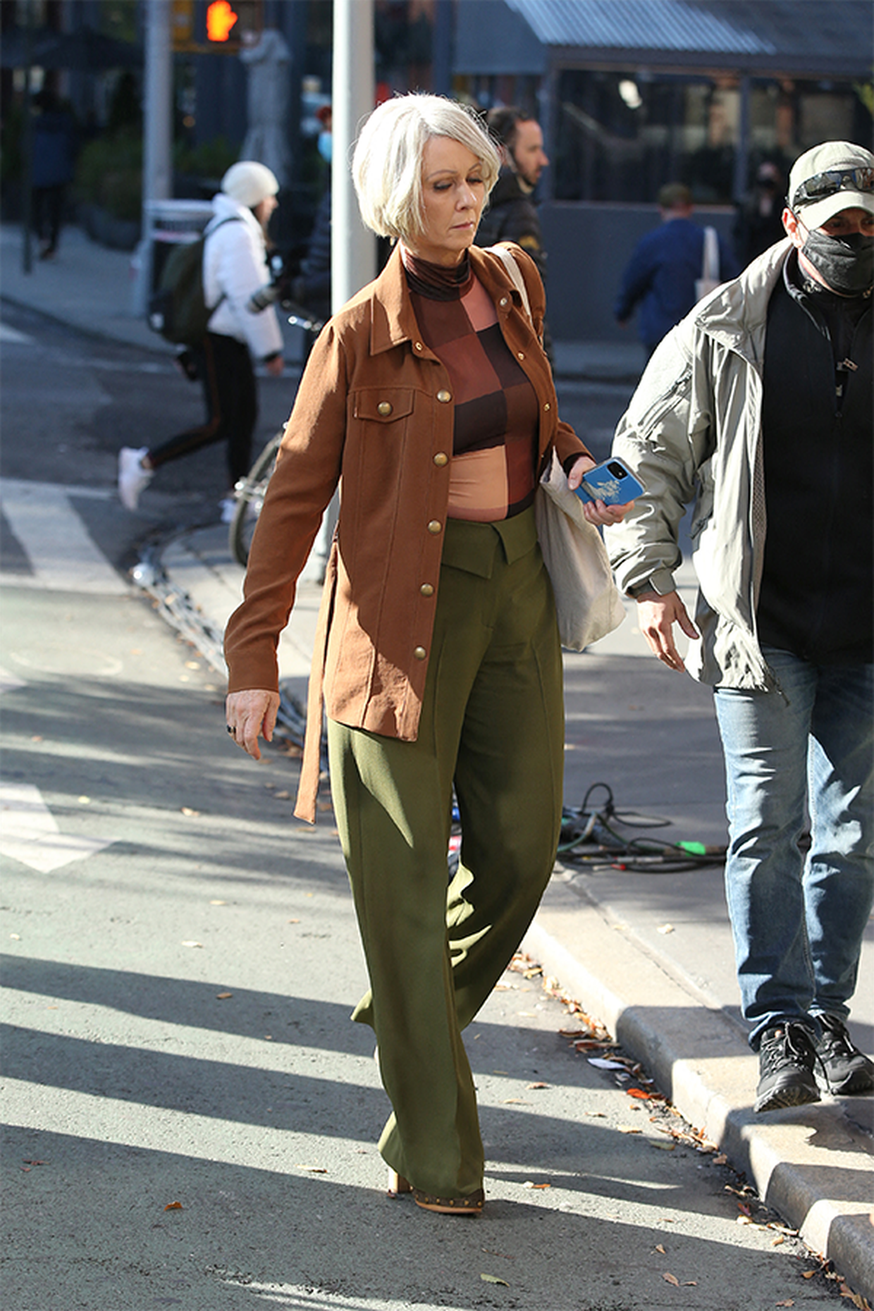 Miranda Hobbes interprétée par Cynthia Nixon en pantalon kaki Jason Wu et top patchwork ALC.