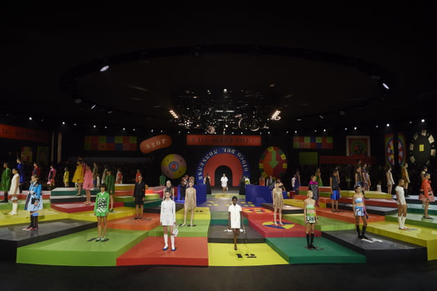 "Le jeu qui n'existe pas". C'est sous ces mots que se sont élancées les mannequins lors du défilé Dior printemps-été 2022. Le show, qui se tenait le 28 septembre à Paris, mettait à l'honneur le thème du jeu. Les invités avaient d'ailleurs reçu une invitation sous forme de jeu de l'oie quelques jours plus tôt. Le podium, rond et pourvu de cases, figurait un plateau sur lesquelles les mannequins avançaient au gré des coups de dés d'un joueur ou d'une joueuse invisible. Sur le catwalk, les tops affichaient une allure very 60, very sporty, aussi. Des robes trois trous, des couleurs pop, des mini que ne renieraient pas Mary Quant, l'inventrice de cette fameuse jupe courtissime et quelques shorts de boxeuses siglés Dior Vibe qui préfiguraient une collaboration avec l'équipementier sportif de luxe Technogym. Peut-être est-ce à cause de cet été 2021 particulièrement pluvieux que sur le podium, les tops s'affichaient en vestes molletonnées et manteaux imprimés. Mais les pièces légères étaient aussi de la partie puisque de nombreuses mannequins défilaient ventre nu, brassières microscopiques en guise de débardeurs. La source d'inspiration du show de Maria Grazia Chiuri, directrice artistique des collections féminines de la maison Dior ? Le travail de Marc Bohan, à la tête de la griffe de 1960 à 1988. En 1961, quelques mois après sa prise de fonction à la suite d'Yves Saint Laurent, le créateur présentait sa collection Slim Look. À l'époque, celle-ci faisait écrire au quotidien français L'Aurore : "Elle change complètement la mode, tout comme le New Look l'a fait en 1947". Déclinées en rouge, jaune, vert, orange, bref des tons qui s'entrechoquent et font autant de bien au cœur qu'aux yeux, les silhouettes Dior printemps-été 2022 rendaient également hommage à l'œuvre d''Anna Paparatti. Cette artiste originaire de Calabre, référence italienne des 60's, a aussi signé la scénographie du défilé.