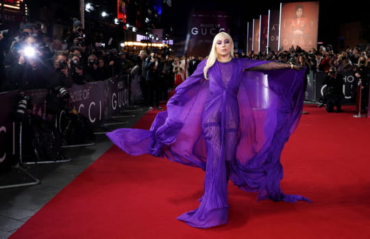 Purple rain ! Lady Gaga s'est fait remarquer lors de la première du film House of Gucci à Londres le mardi 10 novembre 2021. L'actrice, qui incarne Patrizia Reggiani dans le long-métrage de Ridley Scott dont la sortie est prévue pour le 24 novembre, portait une longue robe plissée violet pourvue d'une cape vaporeuse. Cette tenue transparente et délicate sort tout droit de l'imagination d'Alessandro Michele, le directeur artistique de la maison Gucci et fait partie de la toute récente collection "Love Parade" qui a défilé à Los Angeles le 3 novembre 2021. Avec cette pièce colorée, la star américaine avait opté pour des bijoux Tiffany & Co., un top noir scintillant, de la lingerie blanche, des bas couture et des bottines noires à plateforme.
