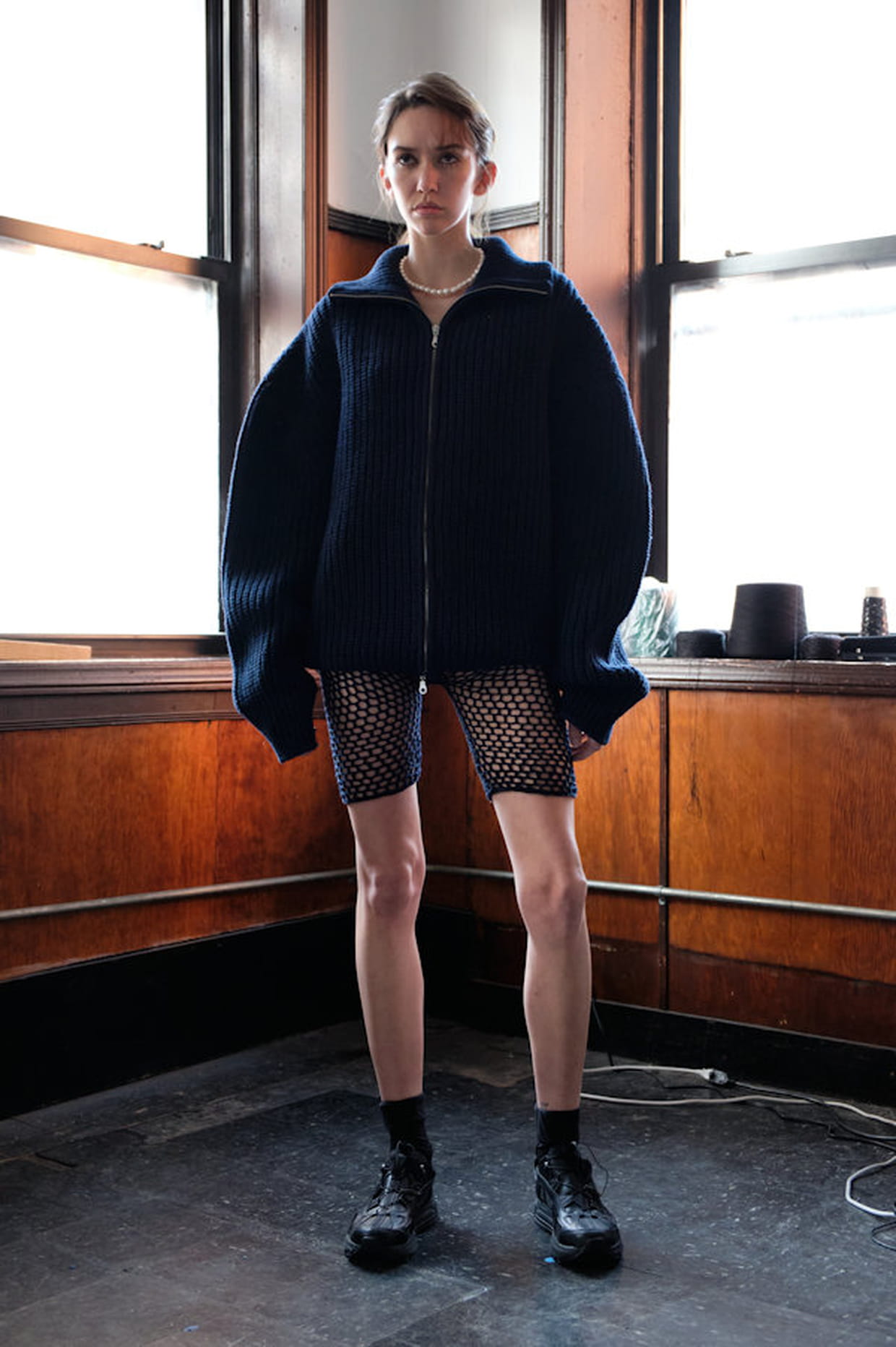 Cycliste en résille et gilet graphique aperçus dans la collection Judy Turner