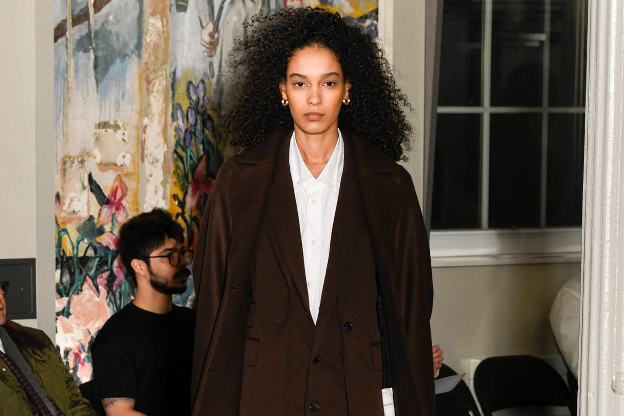Tailleur chocolat et chemise blanche aperçus sur le défilé A--Company automne-hiver 2023-2024 à New York.