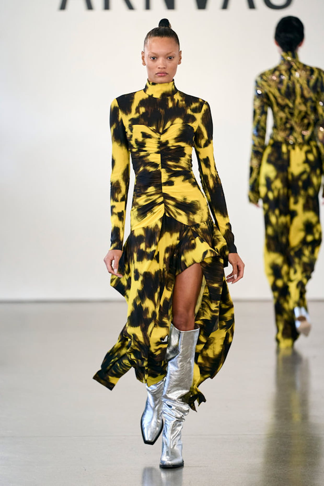 Robe imprimée jaune et noir fendue aperçue sur le défilé Aknvas