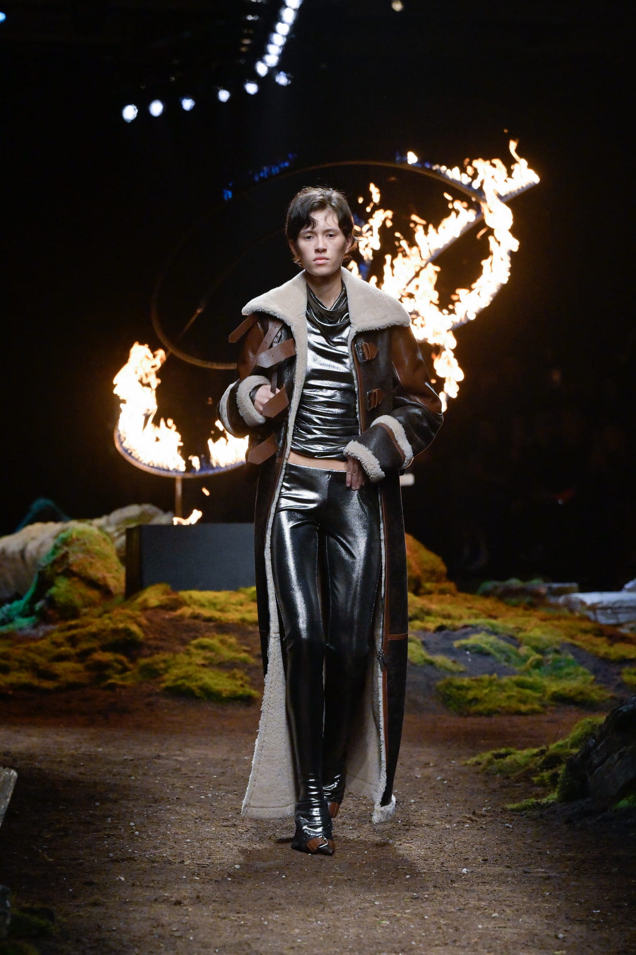 Long manteau en peau retournée et ensemble top et pantalon métallisés aperçus sur le défilé Blumarine automne-hiver 2023-2024 à Milan.