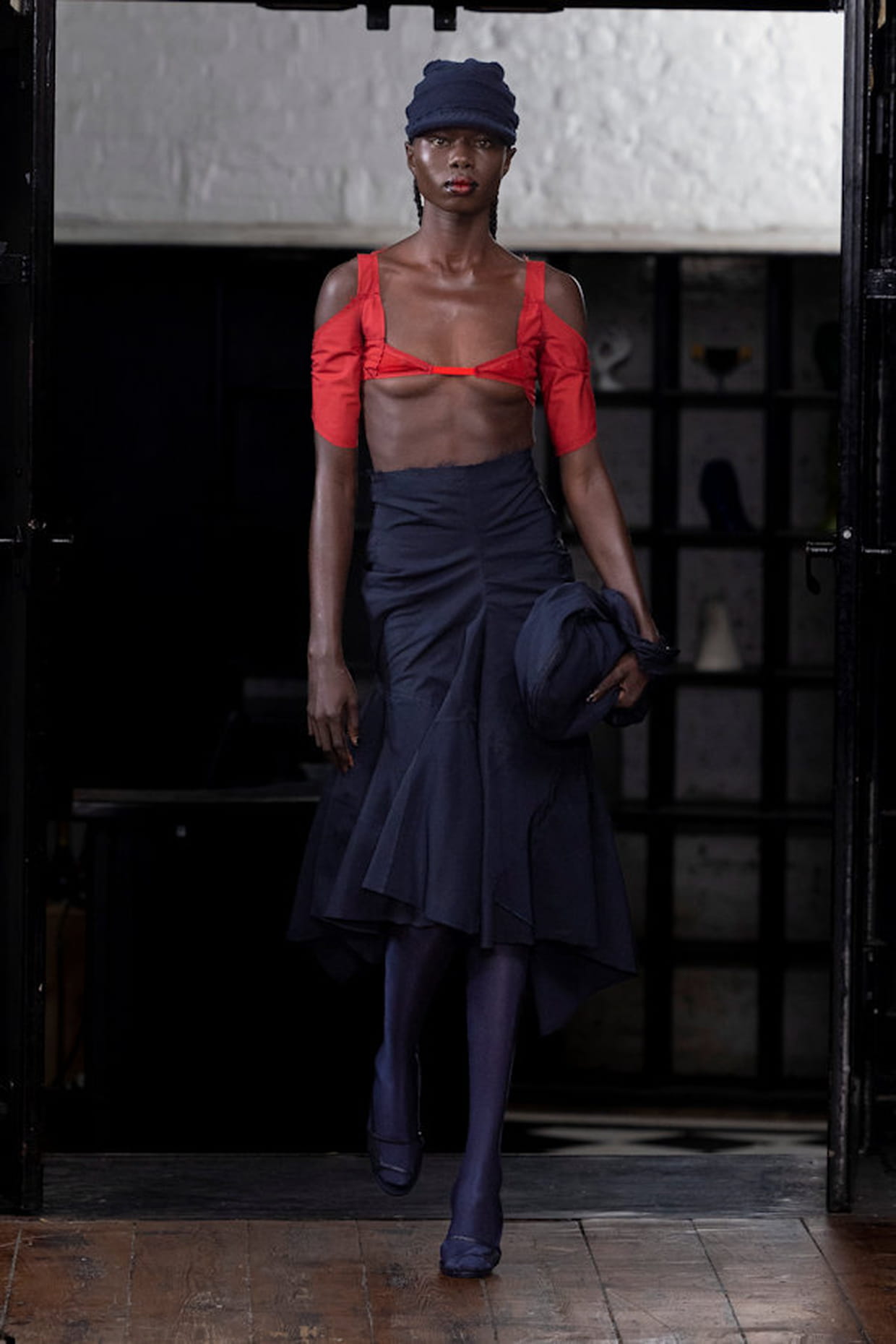 Top rouge à découpes et jupe bleue marine aperçus sur le défilé Talia Byre