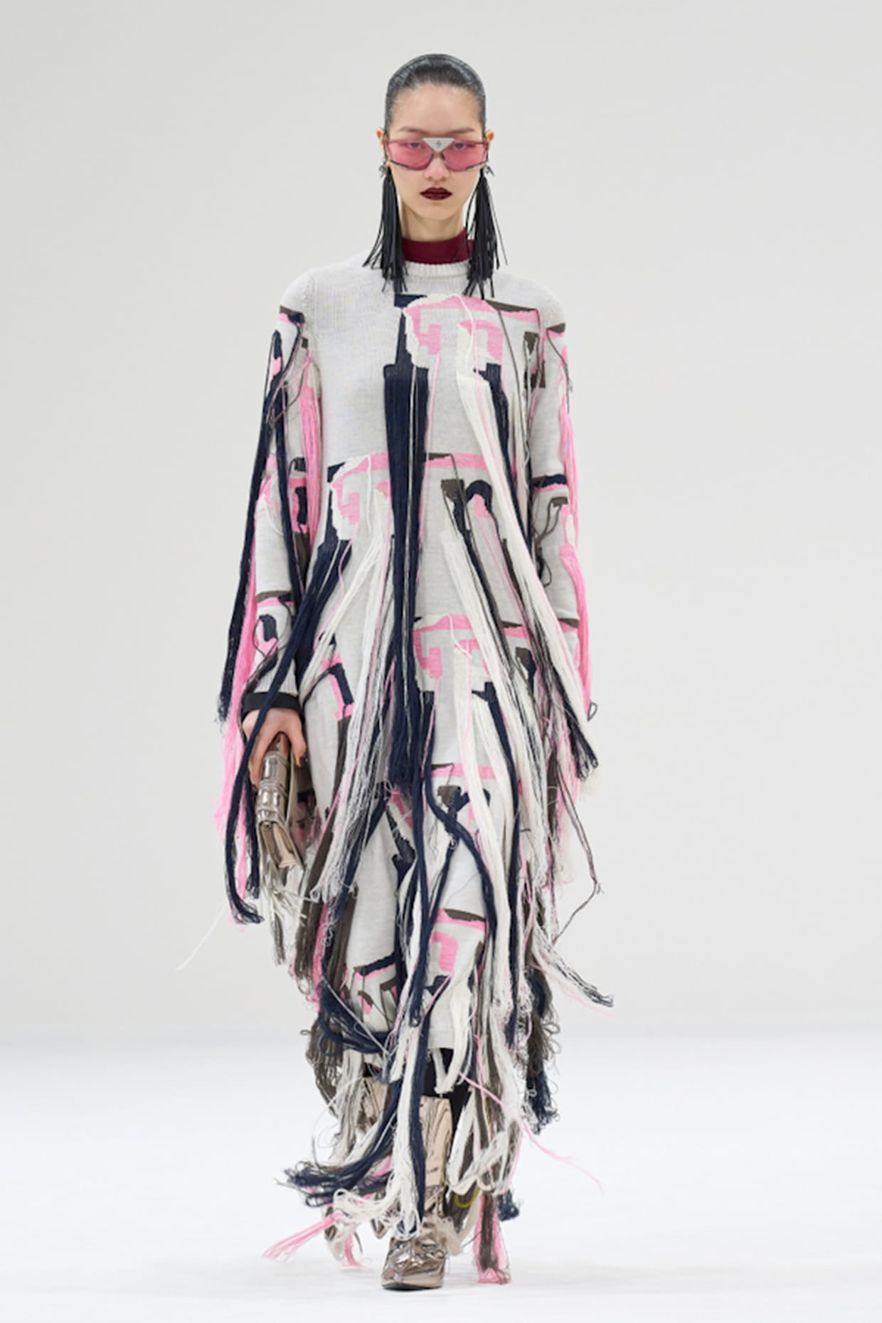 Robe pull multicolore à franges aperçue sur le défilé Ferrari automne-hiver 2023-2024 à Milan.