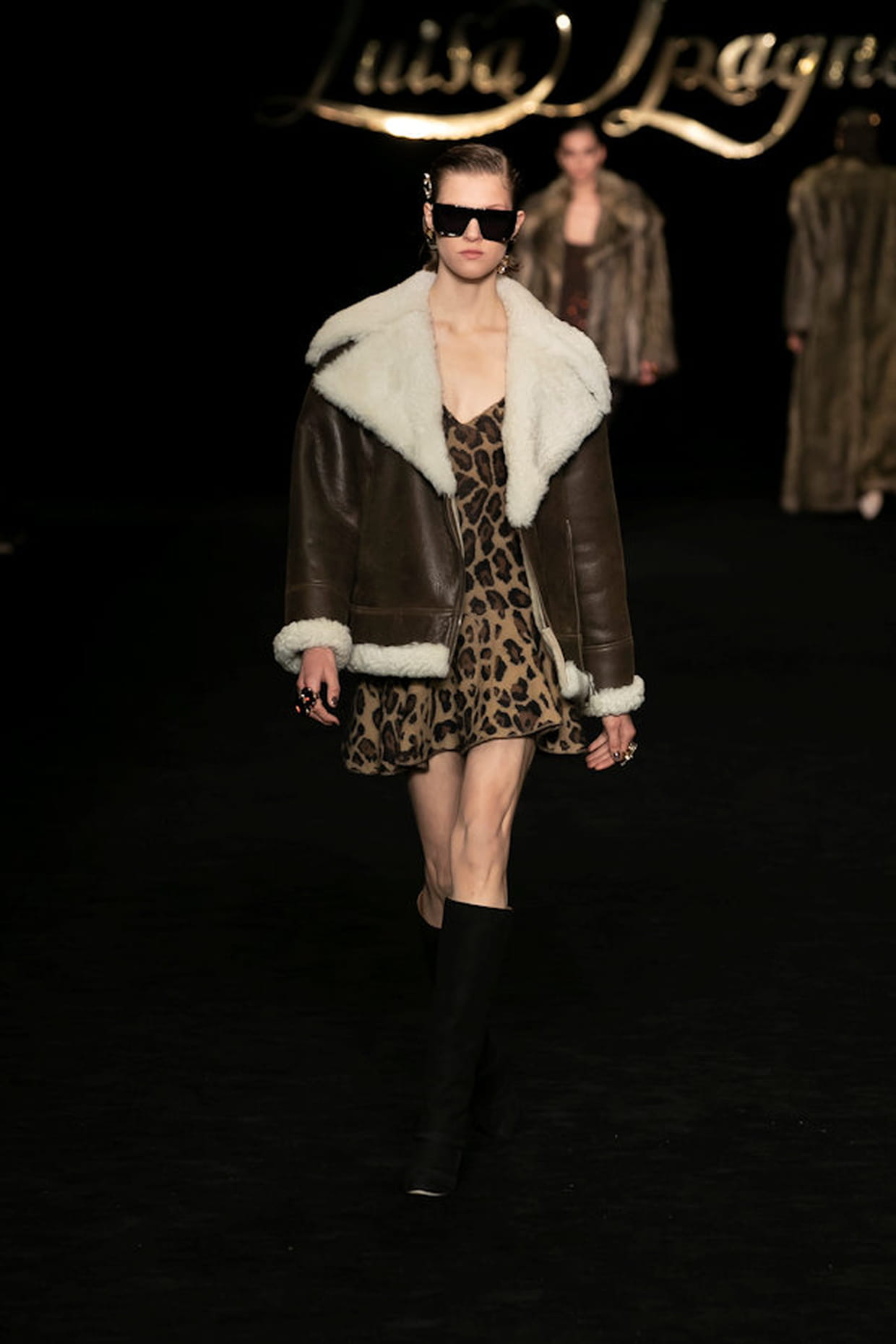 Veste en peau retournée et robe imprimée léopard aperçues sur le défilé Luisa Spagnoli