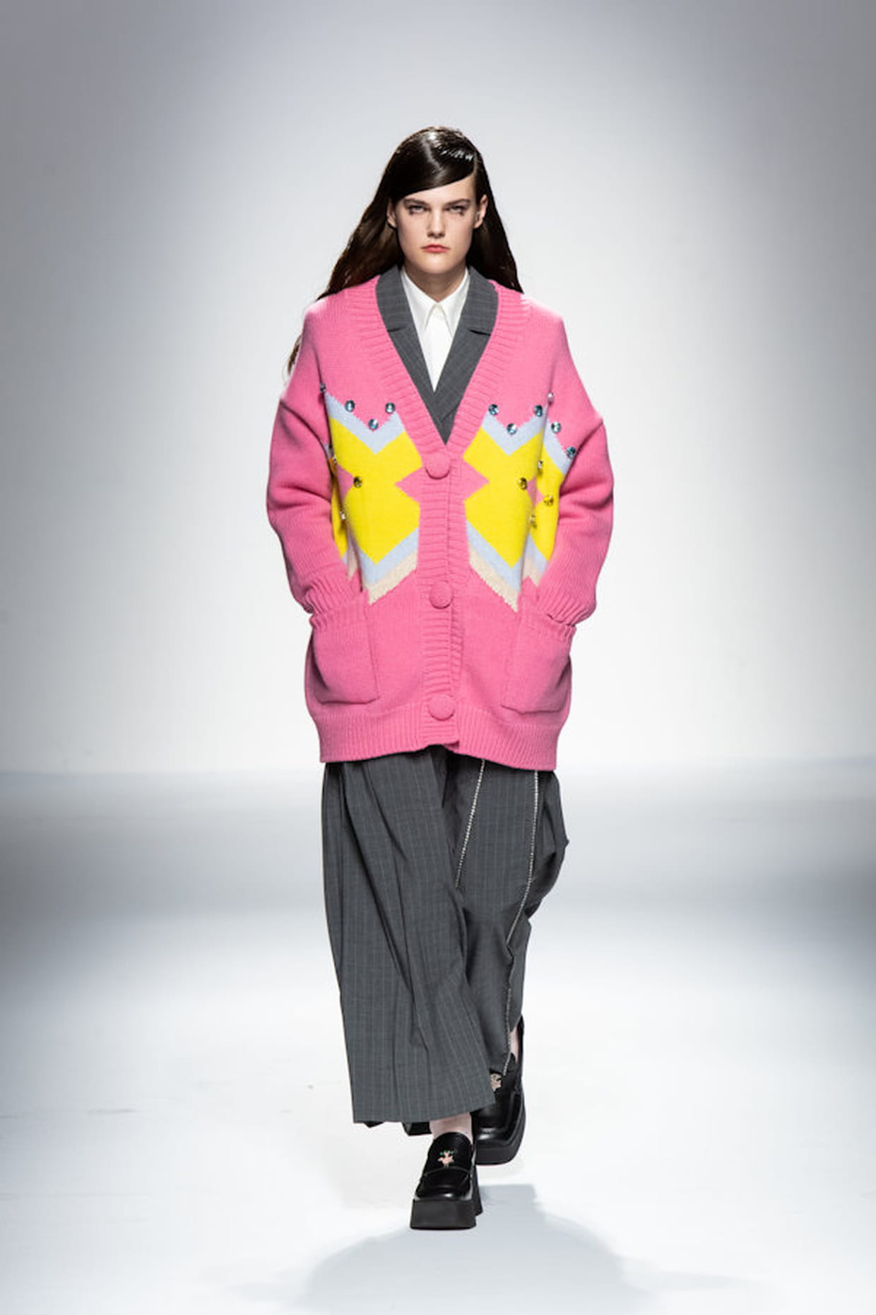 Gilet rose, bleu et jaune et robe grise aperçus sur le défilé Vivetta