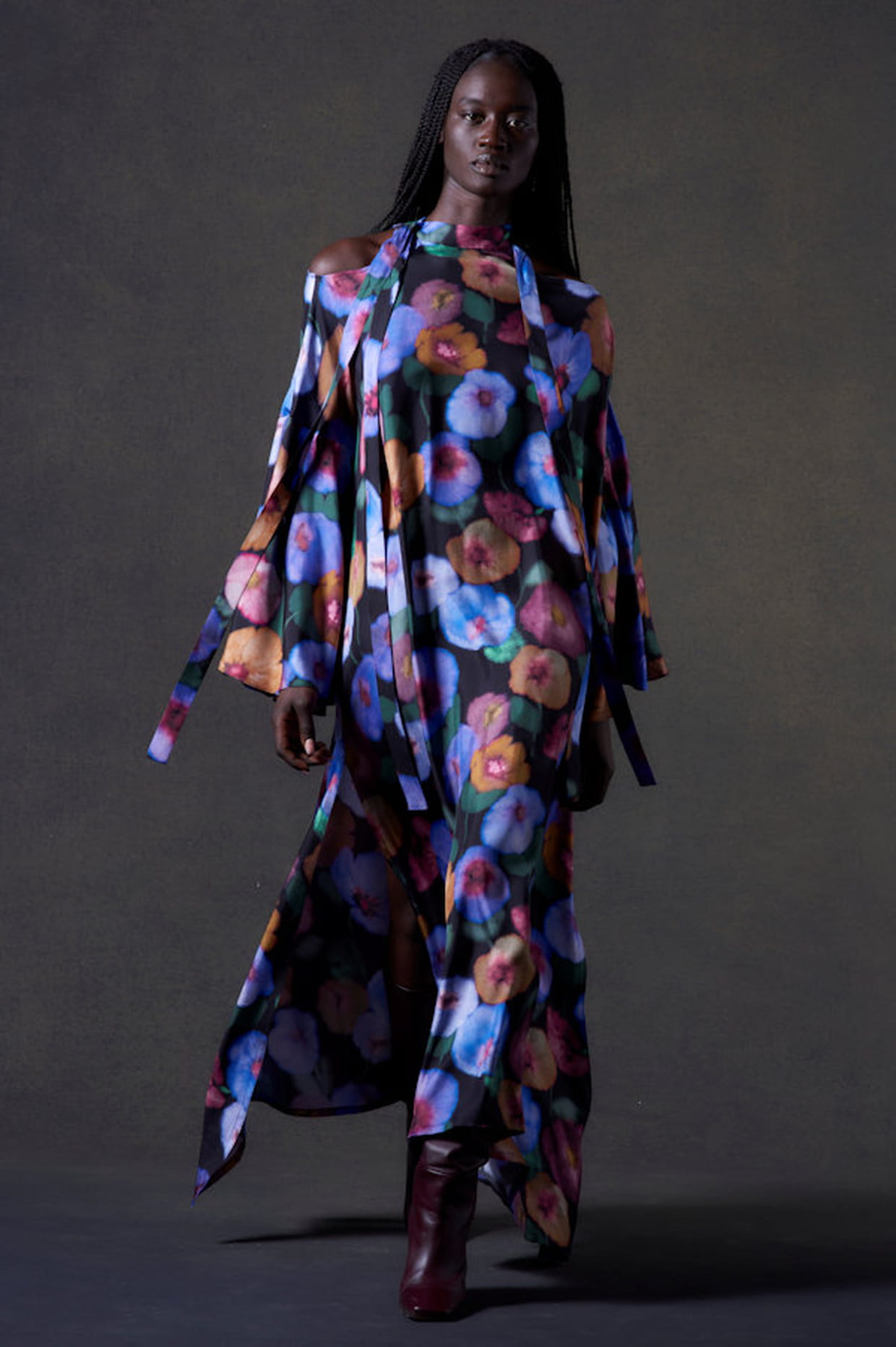 Robe à fleurs multicolores aperçue dans la collection Benjamin Benmoyal automne-hiver 2023-2024 à Paris.