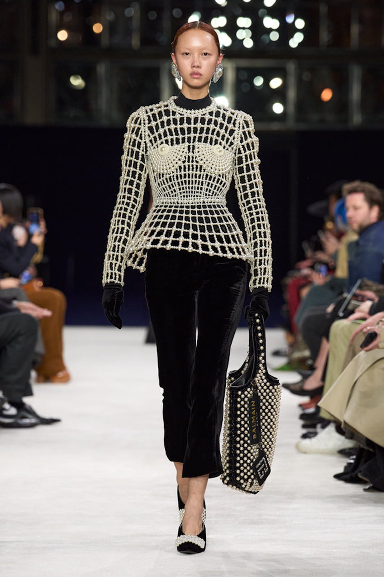 Pantalon en velours et top peplum en perles aperçus sur le défilé Balmain