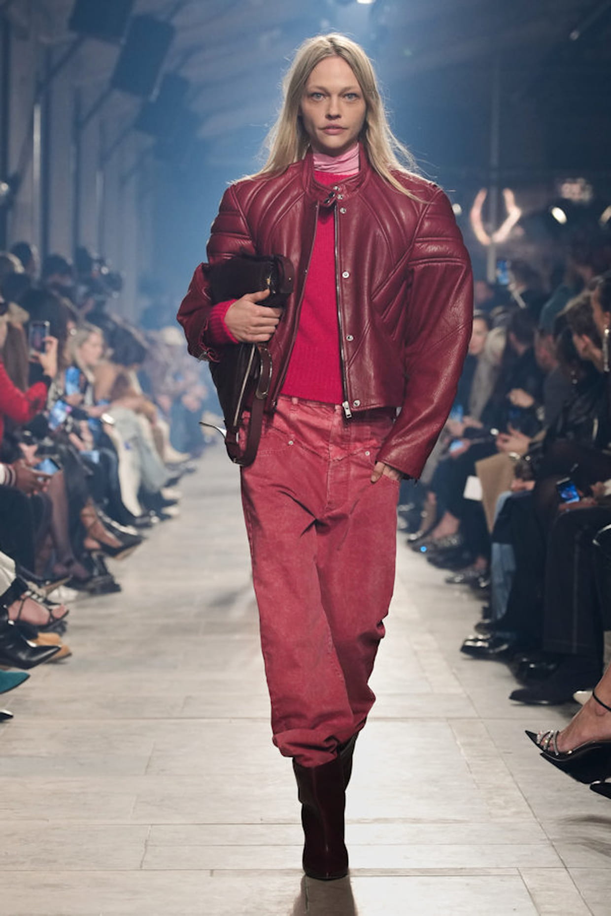Veste de biker bordeaux et jean large framboise aperçus sur le défilé Isabel Marant