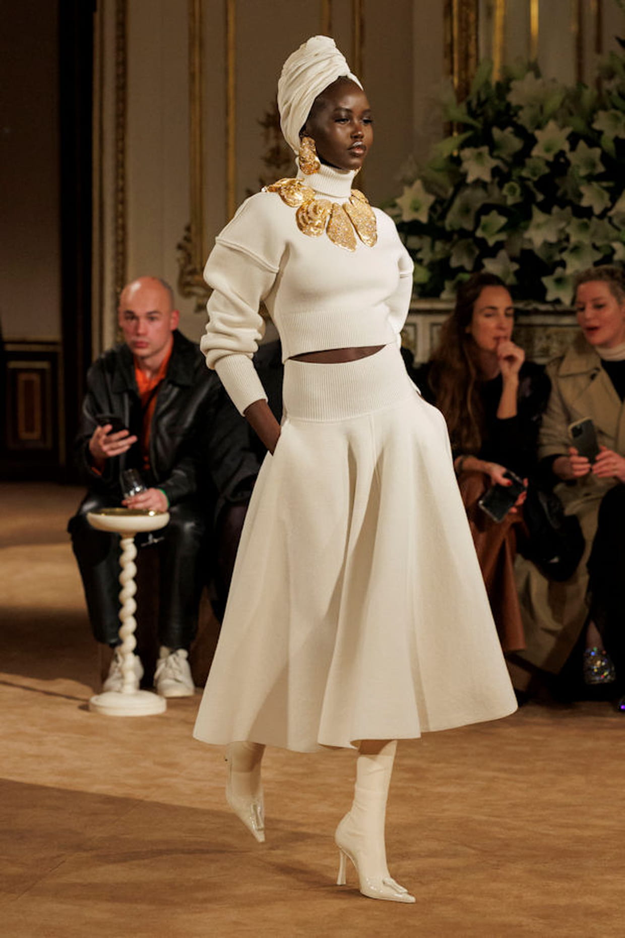 Pull blanc court et jupe midi coordonnée aperçus sur le défilé Schiaparelli automne-hiver 2023-2024 à Paris.
