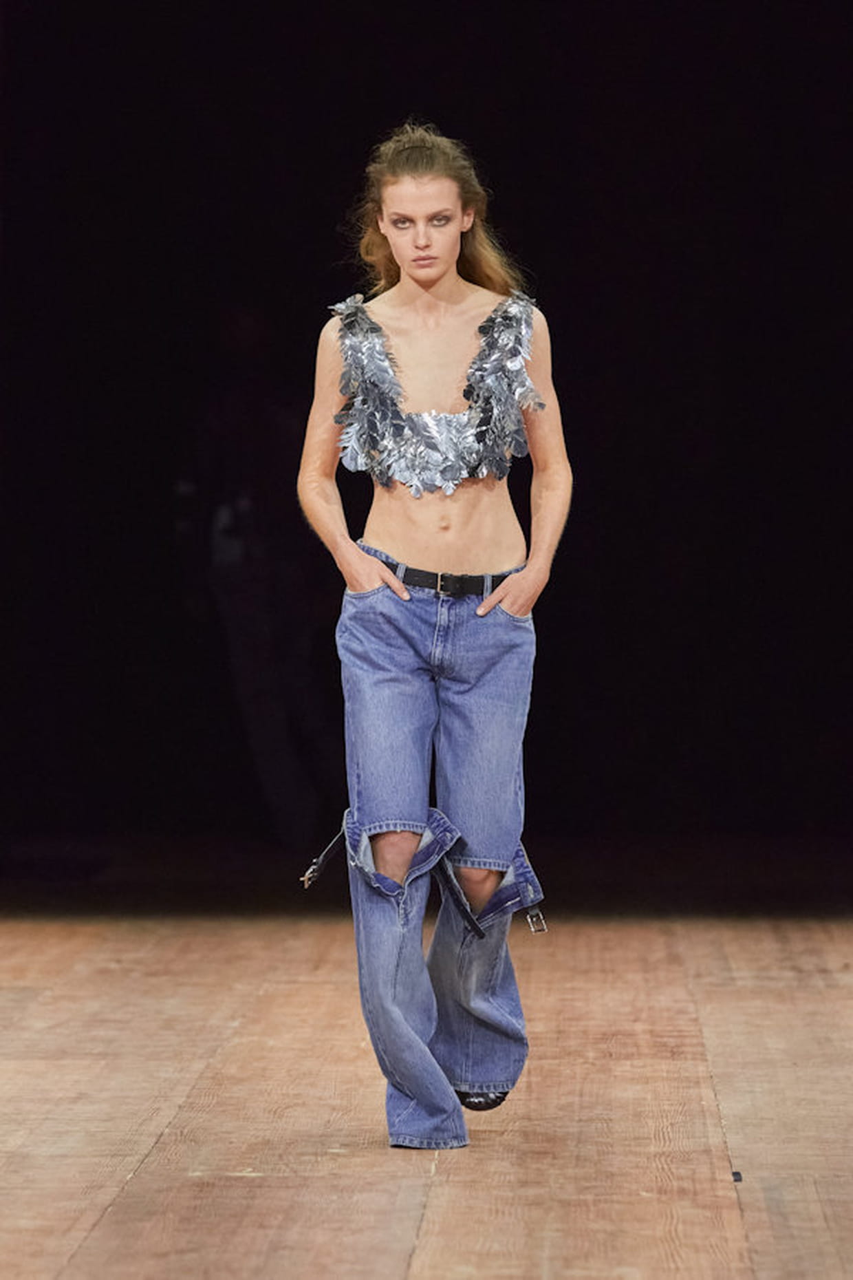 Top métallique et jean large ouvert sur les genoux aperçus sur le défilé Coperni