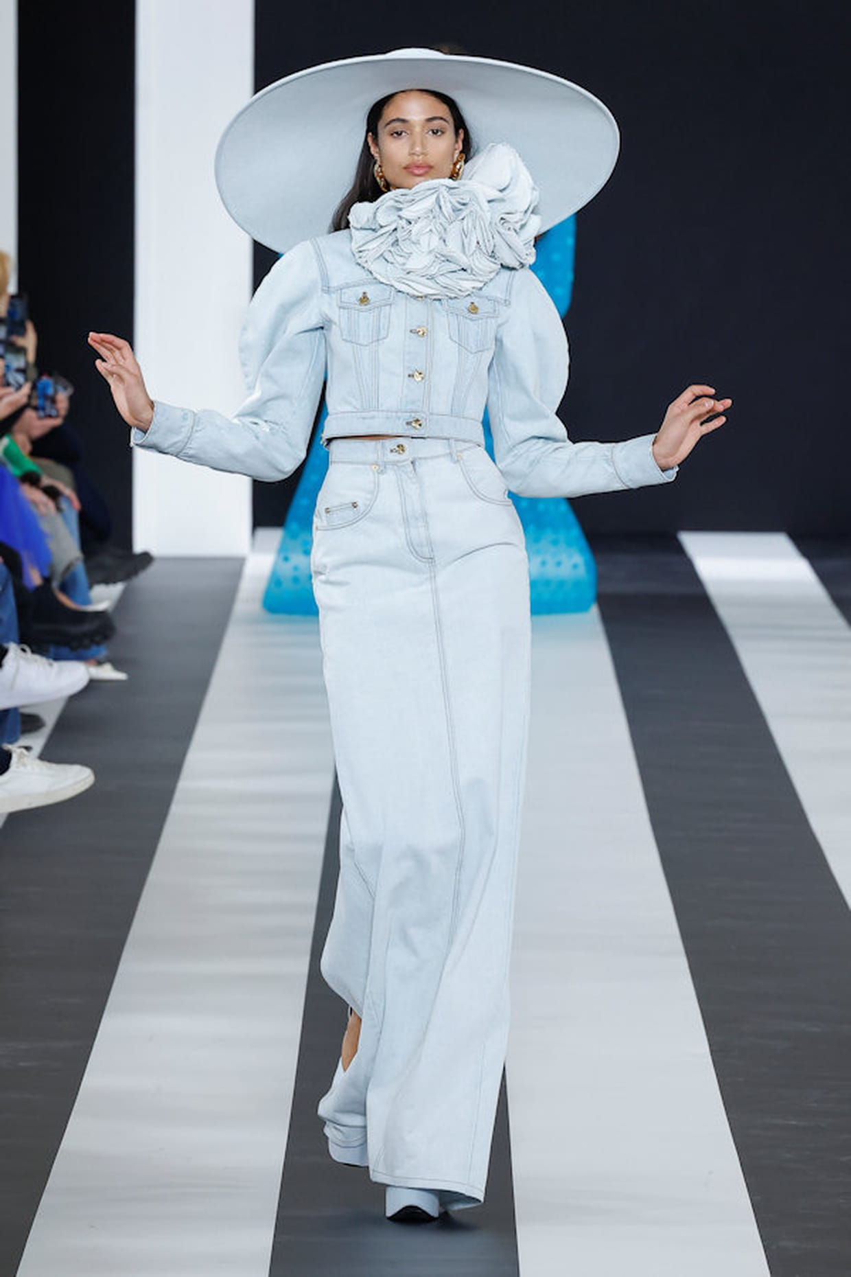 Total look en jean délavé aperçu sur le défilé Nina Ricci automne-hiver 2023-2024 à Paris.