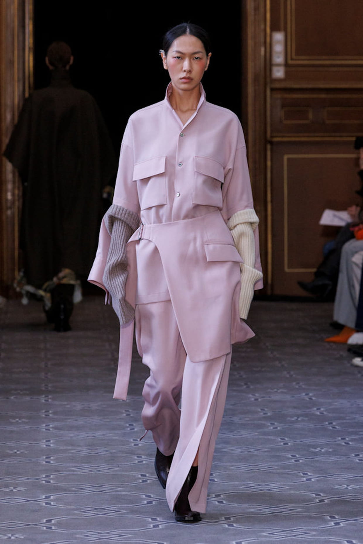 Chemise à poches plaquées et pantalon fendu rose dragée aperçus sur le défilé Ujoh