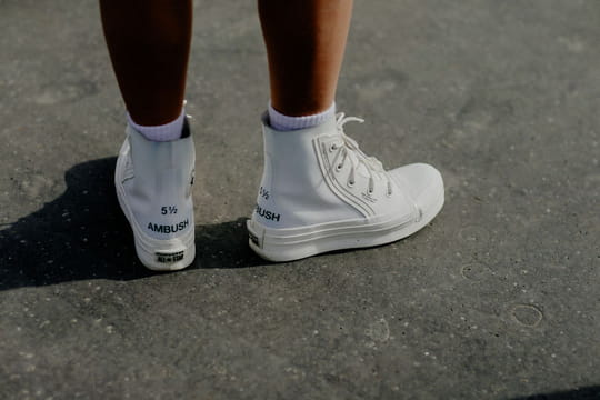 Ce modèle, inspiré de l'emblématique paire Chuck Taylor, est, comme l'originale, montant, composé de toile de coton, pourvu d'un bout rond en plastique blanc et d'un patch étoilé au niveau de la malléole. Seulement, à l'inverse de l'ancienne star des terrains de basket, il n'est pas doté d'une fine semelle blanche, mais d'un talon carré de quelques centimètres. Déclinée en noir ou en crème, cette paire de baskets unisexe est disponible du 35 au 45 au prix de 130 euros sur le site Internet de la marque. Convaincues ?