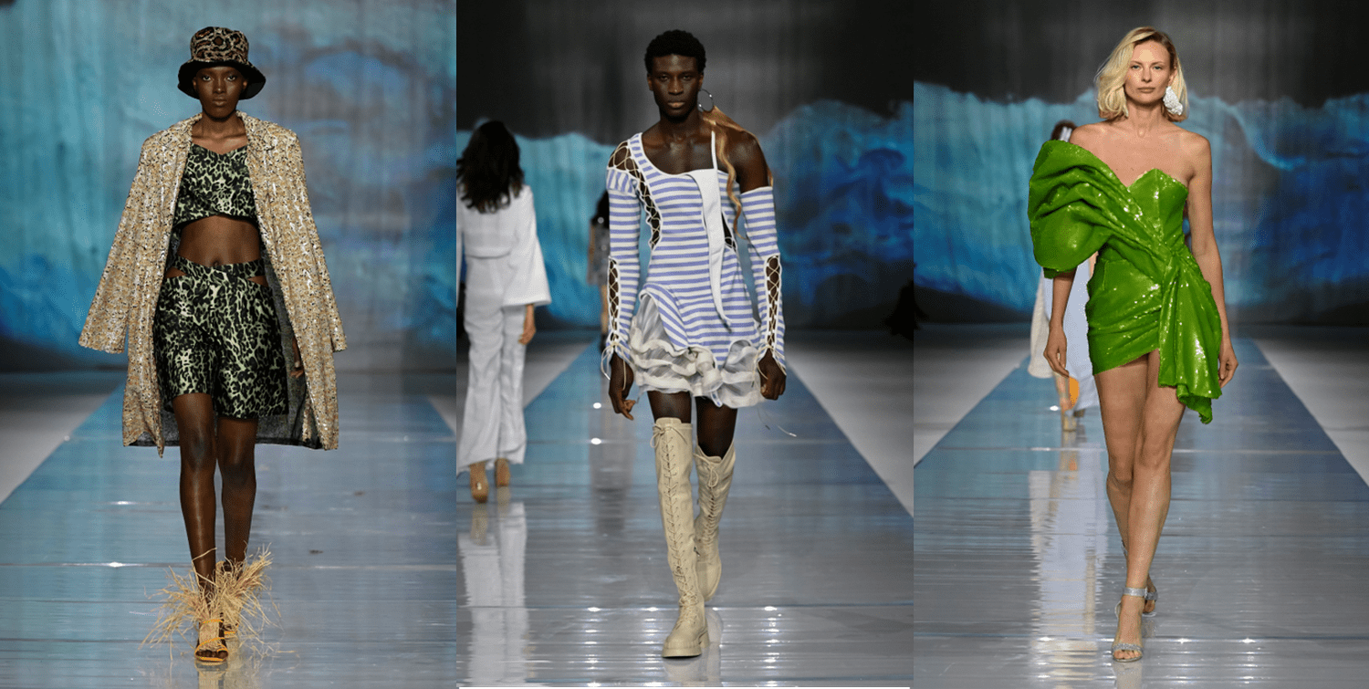 Pour le défilé SHEIN X, le styliste formé à l'école IFA Paris a réalisé trois tenues à l'imprimé panthère kaki-noir réhaussé de lamé or pour apporter lumière et panache. Les accessoires fabriqués à partir de raphia – chapeau, sandales - tranchent subtilement avec la sophistication des matières. On imagine une amazone urbaine marcher avec assurance sur le bitume de la ville, loin d'un environnement naturel. Et ce contraste fonctionne et donne envie !