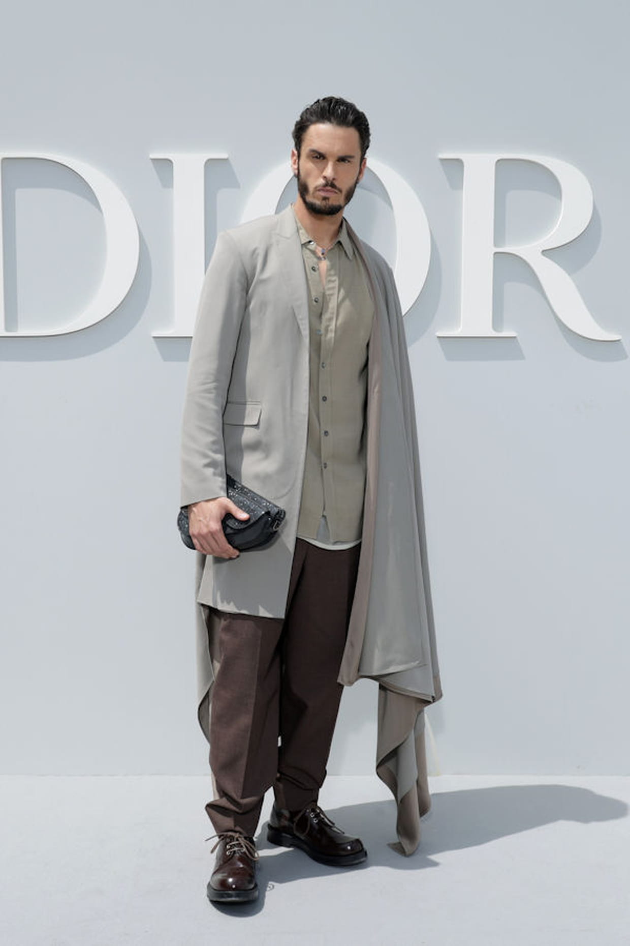 Baptiste Giabiconi en blazer asymétrique et chemise en lin au défilé Dior pendant la Fashion week homme printemps-été 2024 à Paris le 23 juin 2023.