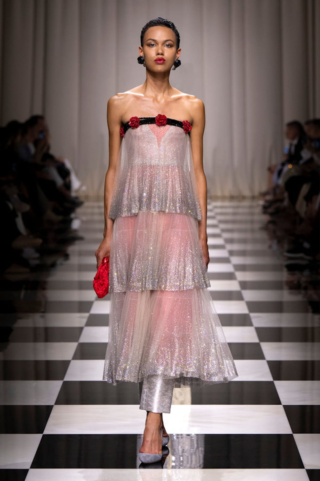 Robe bustier à volants et pantalon métallisé aperçu sur le défilé Giorgio Armani Privé haute couture