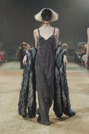 Robe pailletée et masque à strass aperçus sur le défilé Area © Area