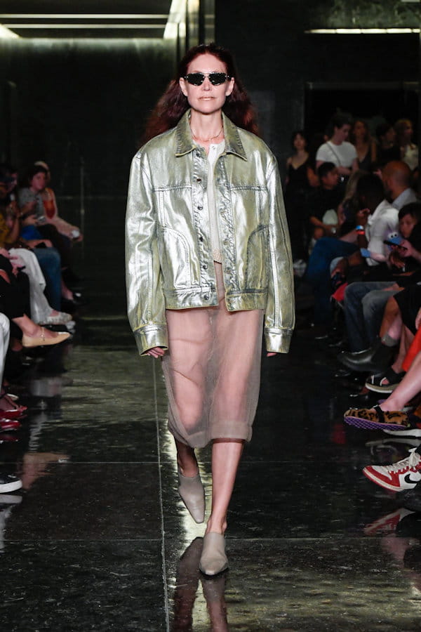Veste métallisée et jupe transparente aperçues sur le défilé Eckhaus Latta