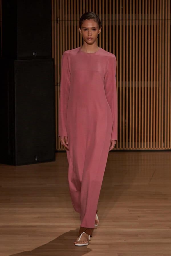 Longue robe vieux rose fluide aperçue sur le défilé Fforme printemps-été 2024 à New York.