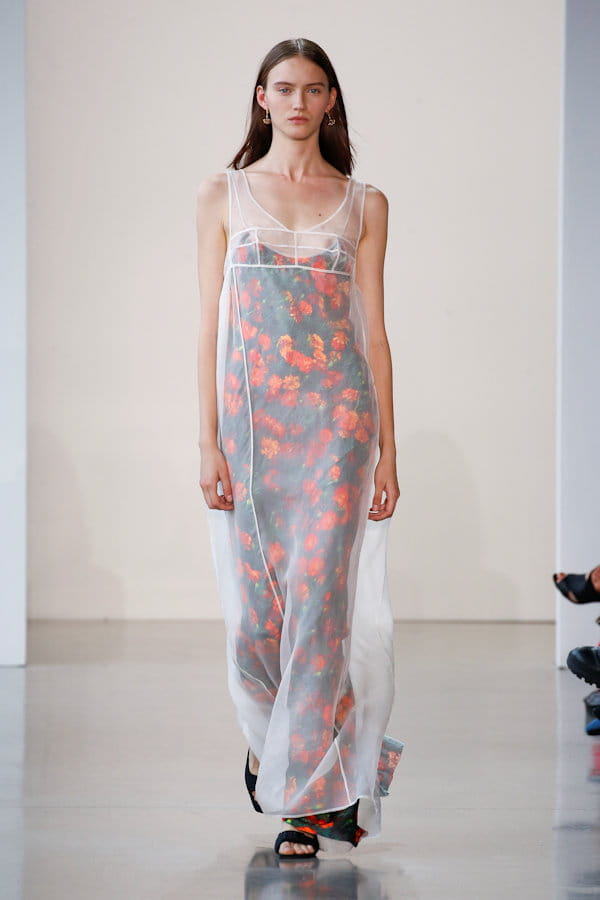 Longue robe à fleurs multicolores et sandales noires aperçues sur le défilé Bevza