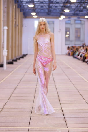 Longue robe irisée transparente et culotte rose aperçues sur le défilé Priscavera