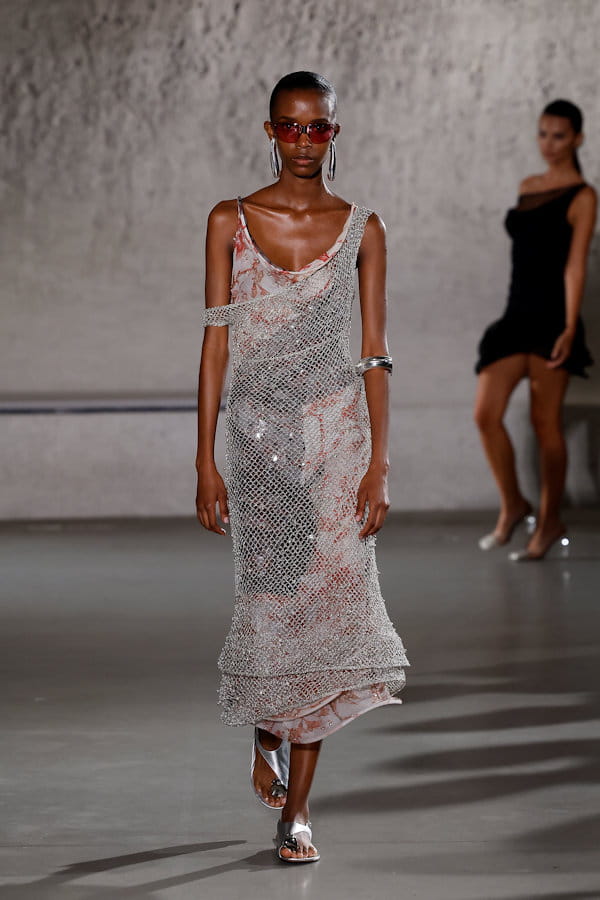 Robe en maille superposée à une robe imprimée aperçues sur le défilé Tory Burch printemps-été 2024 à New York.