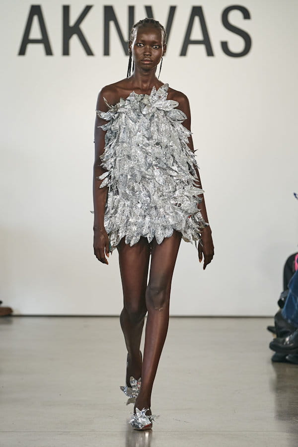 Robe bustier à plumes métallisées aperçue sur le défilé Aknvas printemps-été 2024 à New York.