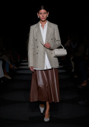 Veste grise, chemise blanche et jupe en cuir chocolat aperçues sur le défilé Altuzarra