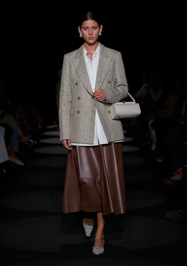 Veste grise, chemise blanche et jupe en cuir chocolat aperçues sur le défilé Altuzarra printemps-été 2024 à New York.