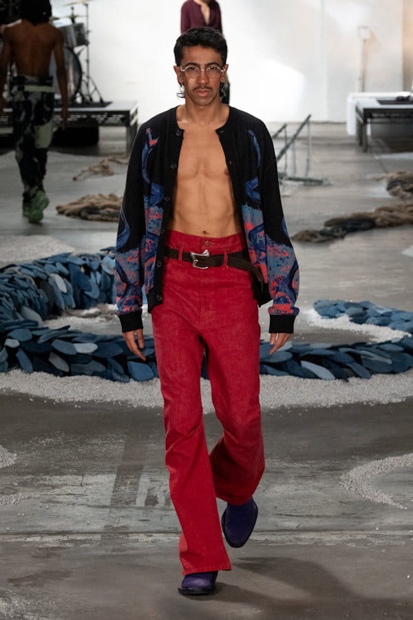 Gilet multicolore tricoté et pantalon rouge aperçus sur le défilé Kozaburo © Kozaburo