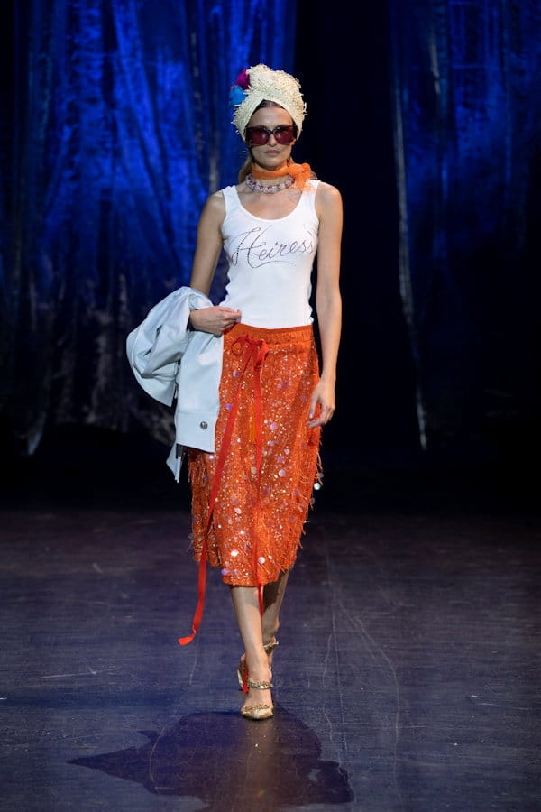 Débardeur blanc, lunettes de soleil et jupe orange aperçus sur le défilé Wiederhoeft © Wiederhoeft