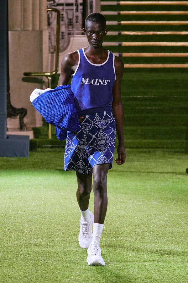 Débardeur et short bleu et blanc aperçus sur le défilé Mains