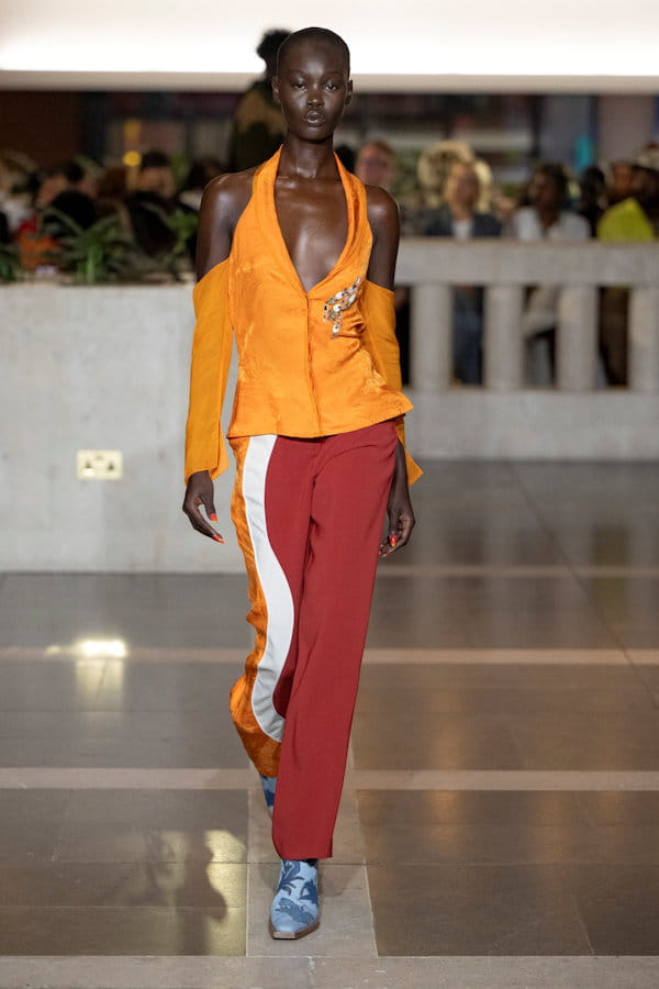 Pantalon rouge à rayures et top orange aperçus sur le défilé Ahluwalia printemps-été 2024 à Londres.