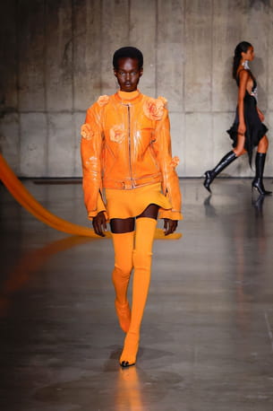Veste orange à fleurs en 3D, minijupe et cuissardes aperçues sur le défilé David Koma printemps-été 2024 à Londres.