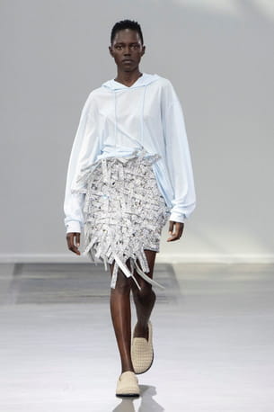 Sweatshirt pastel et jupe à franges argenté aperçus sur le défilé JW Anderson © JW Anderson