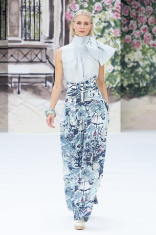Top pastel à lavallière et pantalon taille haute large imprimé aperçus sur le défilé Paul Costelloe © Paul Costelloe