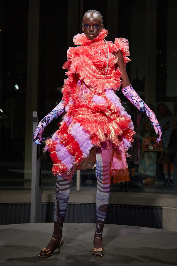 Robe rouge à froufrous et gants multicolores aperçus sur le défilé Matty Bovan © Matty Bovan