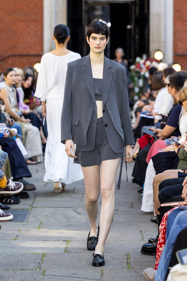 Veste gris asphalte, brassière et short coordonnés aperçus sur le défilé Eudon Choi printemps-été 2024 à Londres.