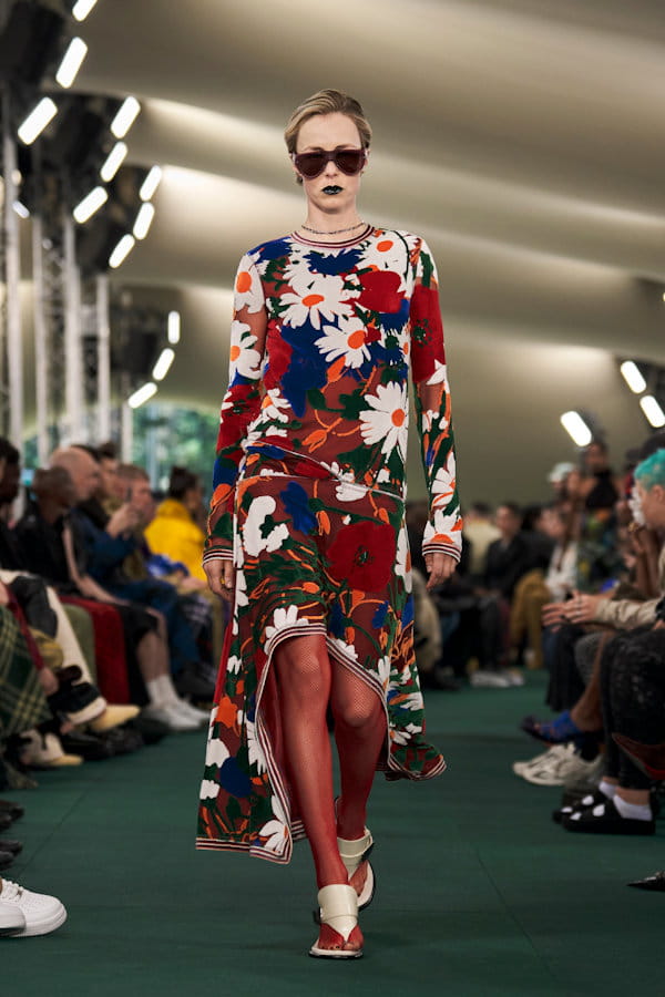 Robe asymétrique à fleurs multicolores et tongs à talons aperçues sur le défilé Burberry © Burberry