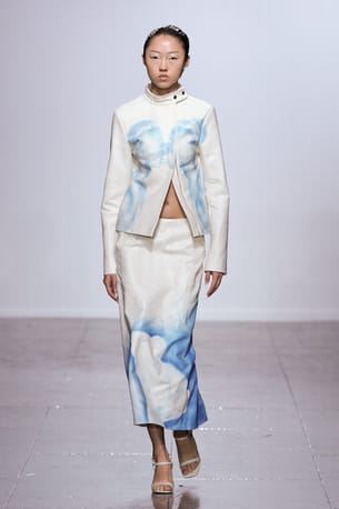 Ensemble blanc imprimé d'un nuage bleu aperçu sur le défilé Chet Lo printemps-été 2024 à Londres.
