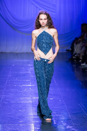 Top géométrique et jean taille basse imprimé aperçus sur le défilé Di Petsa