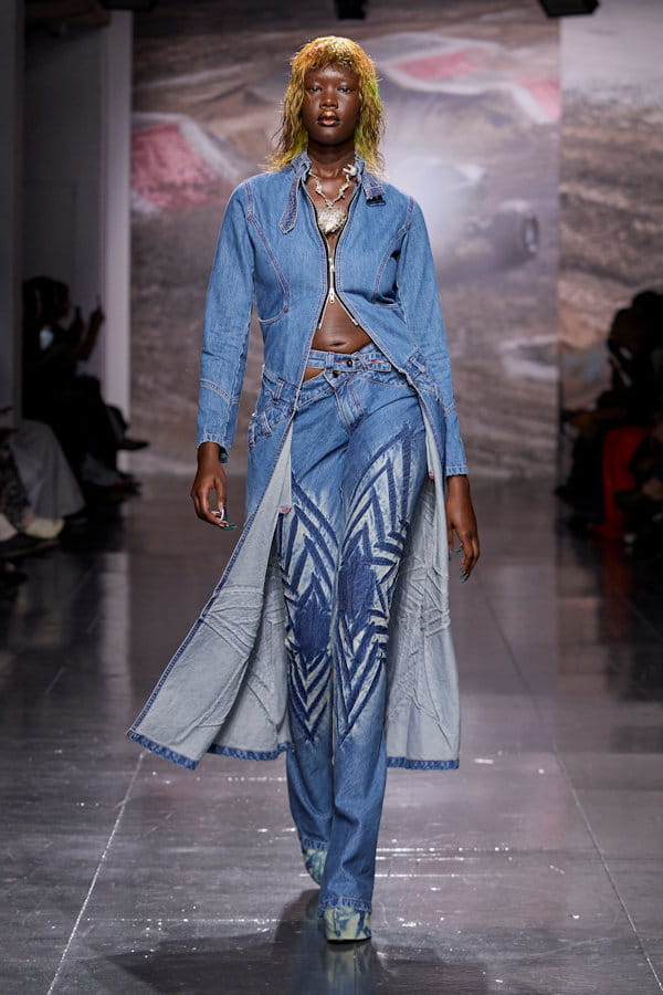 Longue veste en jean et denim étoilé aperçus sur le défilé Masha Popova printemps-été 2024 à Londres.