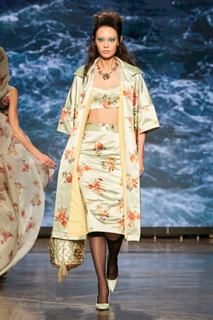 Manteau, brassière et jupe crayon en satin pastel imprimé fleur aperçus sur le défilé Antonio Marras