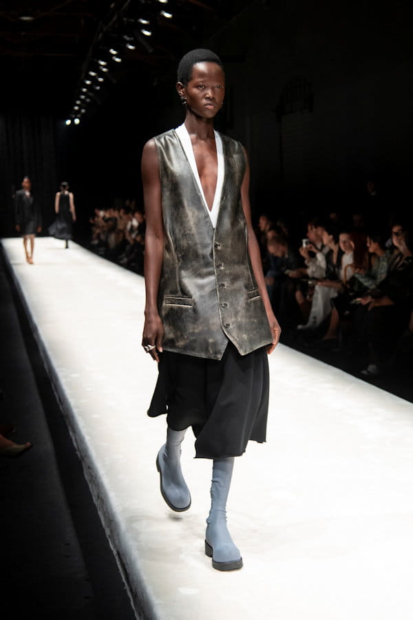 Veste en cuir sans manches, jupe noire et boots bleues aperçues sur le défilé MM6 Maison Margiela © MM6 Maison Margiela