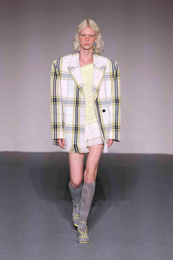 Veste oversize à carreaux, jupe frangée et top pastel aperçus sur le défilé MSGM