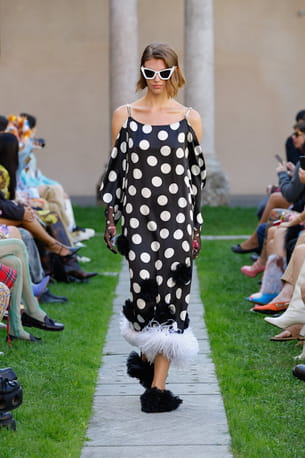 Robe noire imprimée de pois blancs à plumes aperçue sur le défilé Shuting Qiu