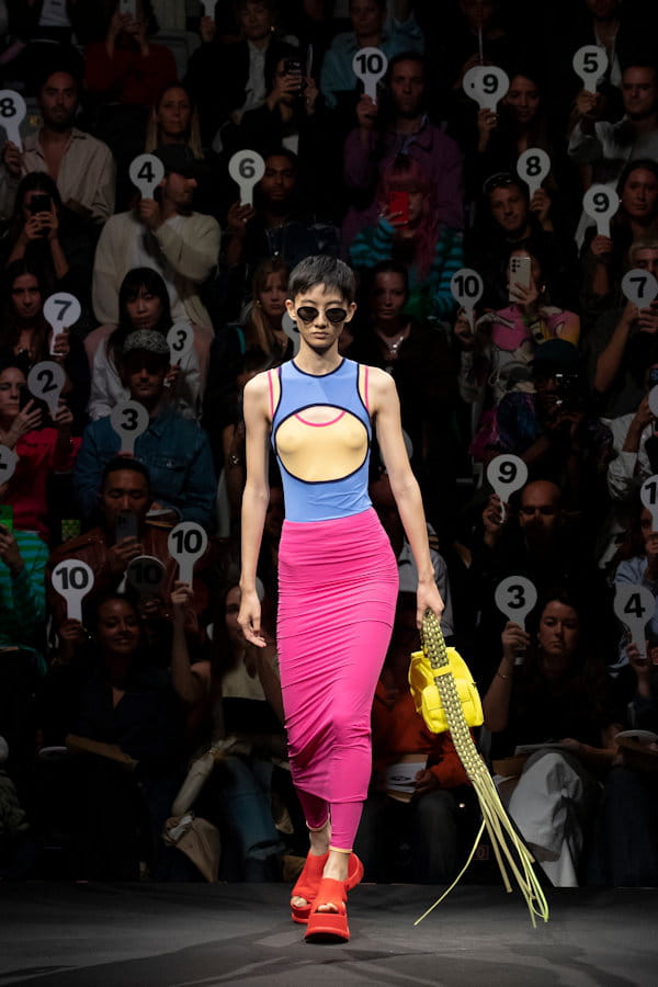 Jupe tube rose fuchsia et débardeur tricolore aperçus sur le défilé Sunnei © Sunnei